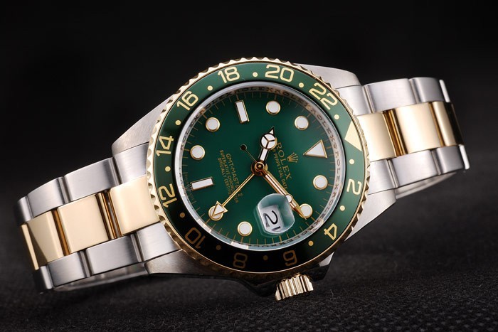 Il movimento automatico e la cassa in acciaio inossidabile spazzolato conferiscono a questo orologio una qualità superiore. Il bracciale in acciaio inossidabile placcato in oro giallo con chiusura deployante incisa con il logo Rolex conferisce un tocco di eleganza e raffinatezza. Il lunetta in ceramica verde con indici dorati e numeri arabi indica i minuti con precisione e stile.